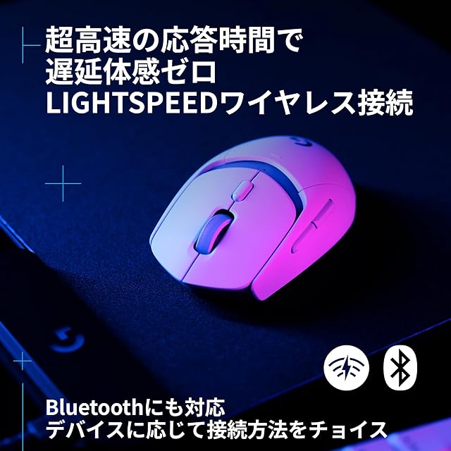 アップデートされたロジクールG独自のワイヤレステクノロジーLIGHTSPEEDワイヤレスレシーバー(USB)で接続/超高速の応答時間で遅延体感ゼロ/Bluetoothにも対応、デバイスに応じて柔軟な接続方法をチョイス