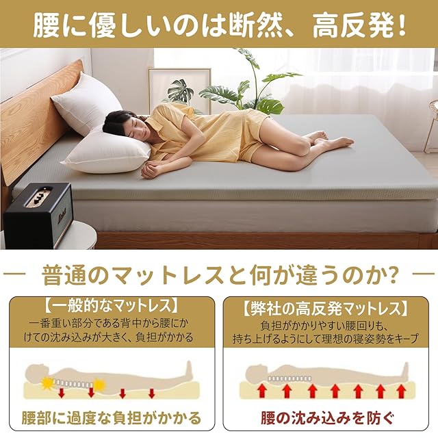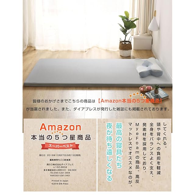 【腰の悩みから解放】MyeFoamの高反発マットレスは優れた反発力(180N 高反発)が特徴で、腰の沈み込みを防ぐ。腰回りも下から持ち上げるように支えて心地良い寝姿勢をキープしてくれます。反発力のある硬めの寝心地で体をしっかり支える、寝返りが打ちやすく就寝時の腰にかかる圧力もかかりません。適度な硬さ&優れた反発力だから、今までのマットレスで背中や腰が沈んでしまって寝にくいといった経験がある方にもおすすめです。皆様のおかげさまでこちらの商品は【本当の5つ星商品】が当選されました。また、ダイアプレスが発行した雑誌にも掲載されております。