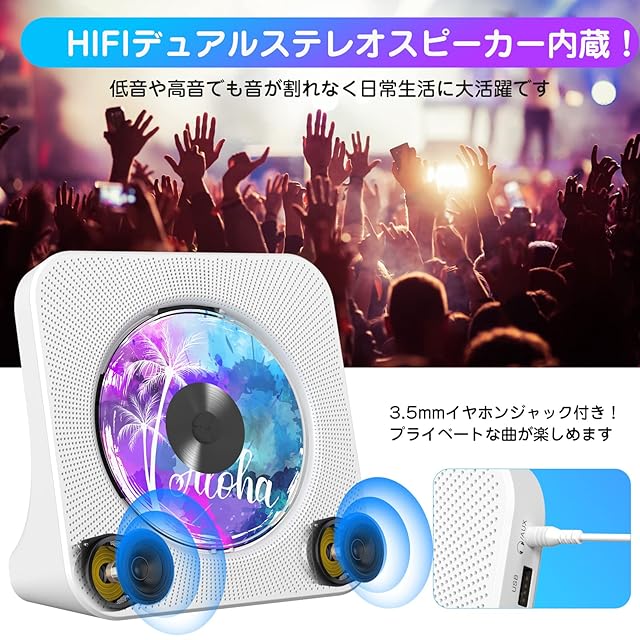 「高音質スピーカー内蔵&3.5mmイヤホンジャック付き」本CDプレーヤーは、立体的なミュージックが再生可能なHi-Fi高音質スピーカーを内蔵しており、低音や高音でも音が割れなく日常生活に大活躍です。更に、3.5mmイヤホンジャックも付いて、別売りの3.5mmイヤホンでプライベートな曲が楽しめます。ご注意:1、イヤホンをプレーヤーに接続する前に必ず音量を下げてください。2、イヤホンの接続の状態でスピーカーがOFFになります。