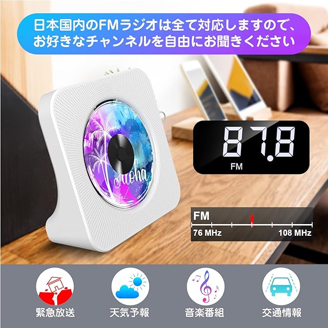 「2023年革新版の多機能CDプレーヤー」本卓上置き式CDプレーヤーはBluetoothを搭載しており、スマホなど他のbluetoothデバイスの音楽が再生できます。CD放送のほかに、本製品はAUX機能も搭載しており、付属のAUXケーブルでCDラジオと車など外部のオーディオデバイスに接続して音楽が再生できます。モバイルバッテリで給電可能とFMラジオ機能(周波数:76KHz-90MHz)付きで、緊急時に実用的な防災ラジオとしても使えます。また、本体またはリモコンの“MODE”でBluetoothモード/CDモード/FMモード/USBモード/AUXモードなど5つのモードを手軽に選択できます。ご注意!ご注意!ご注意!1、本製品は、対応するUSBメモリーカードをCDモードで挿入すると、自動的にUSBメモリーカードを読み込み、音楽を再生することができます。2、本製品はFAT16/FAT32のUSBメモリーカードに対応します。NTFSに対応しません。ご了承ください。