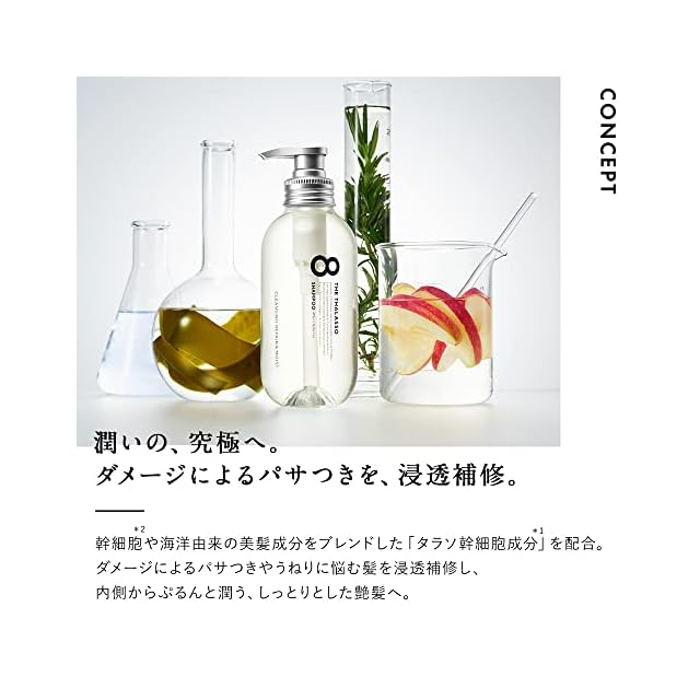 幹細胞エキス*と、海洋由来成分などを贅沢に配合した「タラソ幹細胞処方」の美容液シャンプーと美容液トリートメント。ダメージを受けたパサつきがちな髪に、水分を届けて束縛。乾燥しがちな頭皮も保湿して美髪作りをサポートし、髪がぷるんと潤い毛先までしっとりまとまります。キメ細やかでクリーミーな泡立ちのシャンプーが、頭皮と髪の汚れを優しく落としながら潤いを与えます。さらに美容液をリッチに配合したトリートメントで、ダメージによる毛髪の空洞化とキューティクルの剥がれを補修。使い続けるほど、髪の水分と油分のバランスを整え、潤いに満ちた「ぷるん髪」へと導きます。心地よく香るやさしいアクアホワイトフローラルの香り。* クリスマムマリチマムカルス培養液、リンゴ果実培養細胞エキス、ブドウ果実細胞エキス、アルガニアスピノサカルス培養エキス(全て保湿)