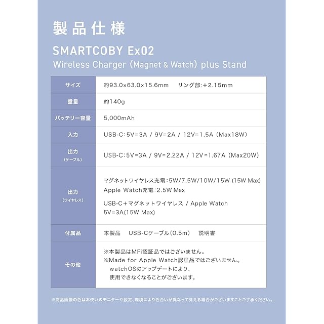 商品名:CIO モバイルバッテリー ワイヤレス充電 iPhone 17 / 16 / 15 マグネット Apple Watch AirPods pro タイプC 5000mAh 軽量 小型 薄型/USB Type-C SMARTCOBY Ex02 Wireless Charger(Magnet & Watch) plus Stand