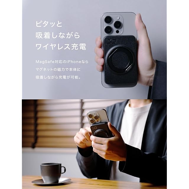 【強力マグネット吸着】iPhone12シリーズ以降のmagsafe対応デバイスにピタッと強力にくっつき、移動中も効率的なワイヤレス充電を実現。磁力で吸着させたまま背面のリングを起こせばスタンドとしても使え、動画を視聴しながらの充電も可能。有線ならスマホバッテリーの急速充電にも対応し、Type-Cポートで最大PD20W出力が可能です。※吸着充電の際は吸着力の観点から、MagSafe対応ケースをご使用ください。