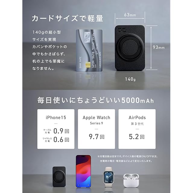 【コンパクトなボディ&毎日使いに丁度良い容量】カードサイズに薄さ15.6mm、約140gと小型で軽量な本体に、毎日持ち歩いて使うのにちょうどいい容量5000mAhを搭載。iPhone15はケーブルからの充電で0.9回、ワイヤレス充電で0.6回充電が可能。Apple Watch(series9)を9.7回、AirPods3を5.2回充電可能で万一の充電切れに対応。