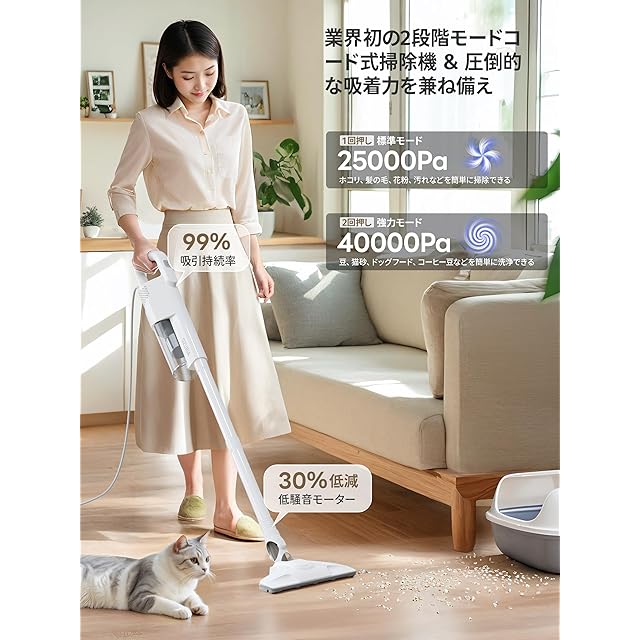 ✨【コードレスよりコード式!持続かつ安定、フルパワーを維持】コードレスクリーナーの吸引力が不安定で、バッテリー残量が少なくなると吸引力が低下になったでしょう?コード式クリーナーは、コンセントから持続かつ安定した電力を供給するため、最初から最後までフルパワーを維持できます!そして、コード式スティック掃除機は黄金比パイプデザイン、遠心分離技術と弱モード25000Pa、強モード40000Paの最大真空度吸引力を実現でき、一人暮らしの部屋はもちろん、広いリビングや階段まで、「吸い取れない」という概念を根本的に打破した。深部に詰まった塵も、重いゴミも、一掃して!電源:AC100V(50/60Hz共通)。2025年10月18日から吸引力が新しくアップグレート!