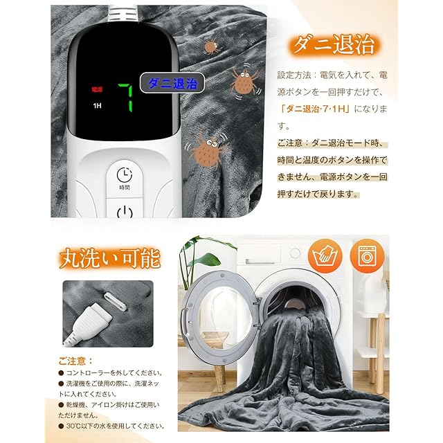 【ダニ退治&抗菌除臭&丸洗い可】ダニ退治機能も搭載されております、電源を入れて、電源ボタンを一回押すとダニ退治モード「7·1H」になります。抗菌除臭にも効果的、黄色ぶどう球菌などの菌が繊維上で増殖することを抑える加工で、細菌が発する「嫌な臭い」を抑えます。また、電気掛け毛布のコントローラーを外すことで洗濯機で丸洗いが可能です。※洗濯の際は、洗濯ネットをご使用ください。ドラム型洗濯機や乾燥機は使用不可。