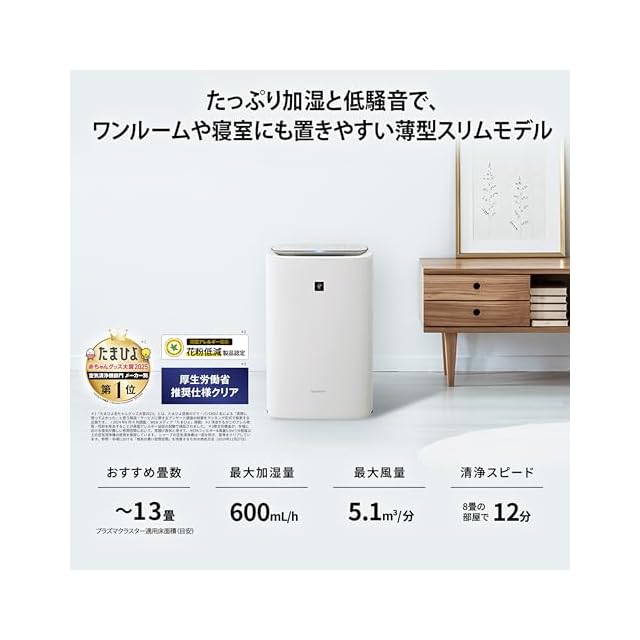 商品名:シャープ 空気清浄機 KI-SS50-W プラズマクラスター 25000 加湿 浮遊・付着ウィルス 花粉 空気浄化 薄型スリム おすすめ畳数 13畳 加湿量 600mL/h