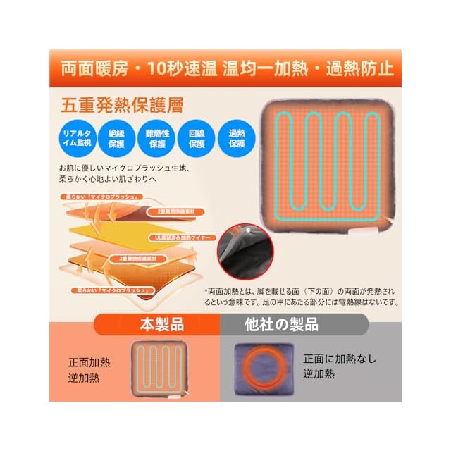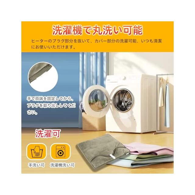 【お肌に優しい生地・優れた保温性・洗濯可能】この電気足温器は暖かくて、超柔らかな肌触りが魅力の「マイクロプラッシュ(Microplush)」を採用します。「マイクロプラッシュ(Microplush)」は、柔らかいビロードのような繊維が特徴です、 繊維の中に空気を含んで熱を逃さないので、フリースよりも保温性に優れています。手洗いだけでなく、洗濯機で丸洗いできます。洗える前に、ヒーターのプラグ部分を抜いて、カバー部分の洗濯可能です。(コントローラーをや電源コードの洗浄はできません。)