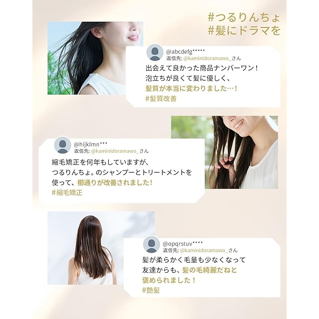 【サラッと軽くまとまりのある髪質へ】髪質に悩む全ての方に 365 日サロン帰りのクオリティ をお届けします。全国の美髪専門店が使用する髪を綺麗にすることに特化し、髪の補修力に優れた本気のトリートメント「つるりんちょ。」 アイロンを使用するメニューをした髪の毛専用に開発さ れました。髪の毛にかかるアイロンなどの「熱」ダメージに注目した新処方のトリートメント。