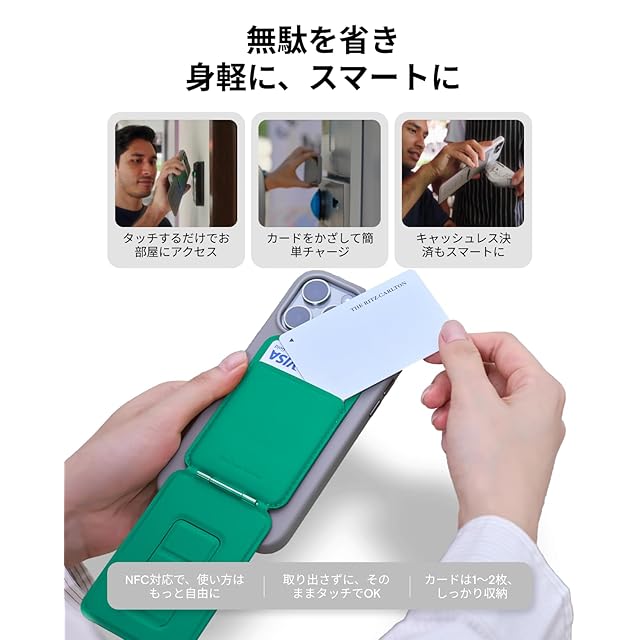 【NFCカード対応!かざすだけでアクセス】マイナンバーカードや運転免許はもちろん、お札や名刺、Suicaなどの交通系ICカードやタッチ決済に対応したクレジットカード、カードキーまで収納可能。カバンから取り出す手間なく、本体ごとタッチするだけでスムーズな決済が可能です。カードケースには1~2枚のカードまで収納できますが、NFC機能を使用するためには、カードを1枚だけ入れてください