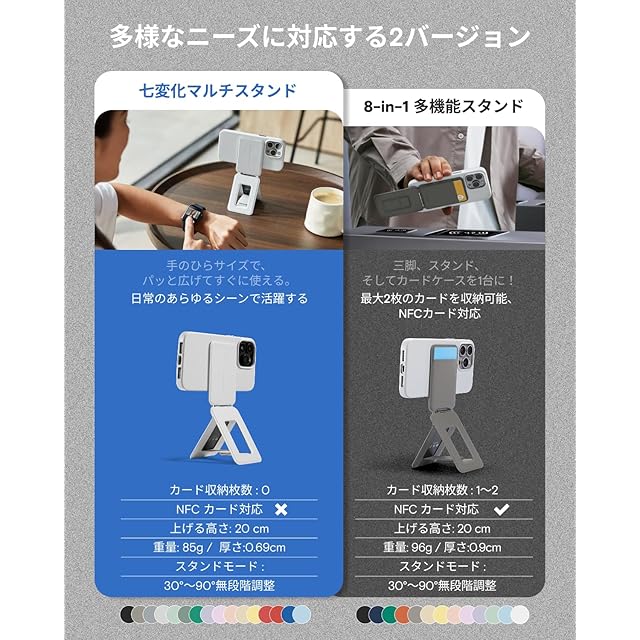 【カードケース追加!全てを1台に】MOFTの超人気「七変化マルチスタンド」をベースに、カード収納スペースを新たに追加し、「8-in-1多機能スタンド」が誕生。Makuakeでは1800人以上のご支援をいただき、多くの方からご好評をいただきました。コンパクトながら多機能で、洗練されたデザインも魅力。このMagSafeカードケースは手に馴染みやすく、どこへ行くにも気軽に持ち運べるので、より快適なスマホライフをお楽しみいただけます。