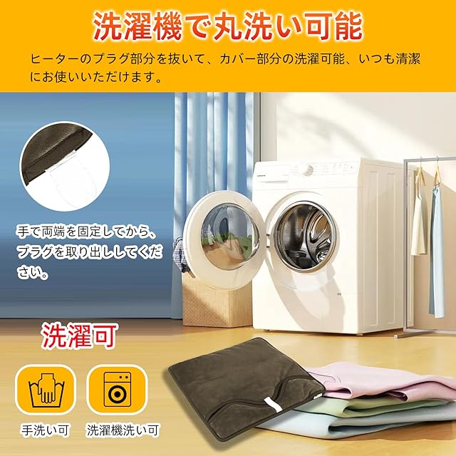 【お肌に優しい生地・優れた保温性・洗濯可能】この電気足温器は暖かくて、超柔らかな肌触りが魅力の「マイクロプラッシュ(Microplush)」を採用します。「マイクロプラッシュ(Microplush)」は、柔らかいビロードのような繊維が特徴です、 繊維の中に空気を含んで熱を逃さないので、フリースよりも保温性に優れています。手洗いだけでなく、洗濯機で丸洗いできます。洗える前に、ヒーターのプラグ部分を抜いて、カバー部分の洗濯可能です。(コントローラーをや電源コードの洗浄はできません。)