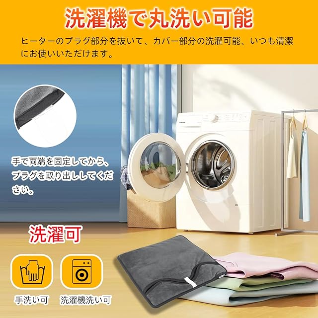 【お肌に優しい生地・優れた保温性・洗濯可能】この電気足温器は暖かくて、超柔らかな肌触りが魅力の「マイクロプラッシュ(Microplush)」を採用します。「マイクロプラッシュ(Microplush)」は、柔らかいビロードのような繊維が特徴です、 繊維の中に空気を含んで熱を逃さないので、フリースよりも保温性に優れています。手洗いだけでなく、洗濯機で丸洗いできます。洗える前に、ヒーターのプラグ部分を抜いて、カバー部分の洗濯可能です。(コントローラーをや電源コードの洗浄はできません。)
