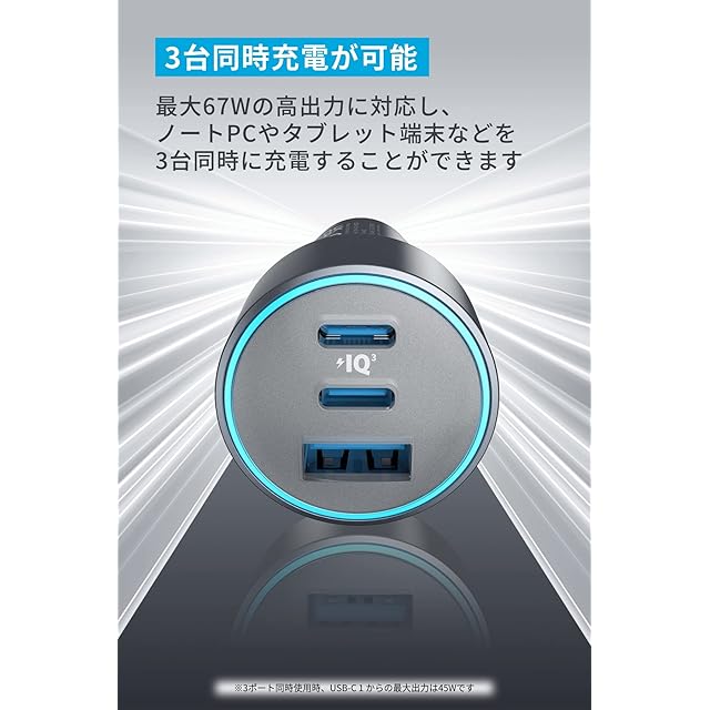 Anker 535 Car Charger (67W) with USB-C & USB-C ケーブル (PD対応 67W 3ポート USB-C カーチャージャー) 【Power Delivery対応/PowerIQ 3.0搭載 / コンパクトサイズ】MacBook Pro iPhone Galaxy Android スマートフォン ノートPC iPad 各種 その他機器対応 各種対応