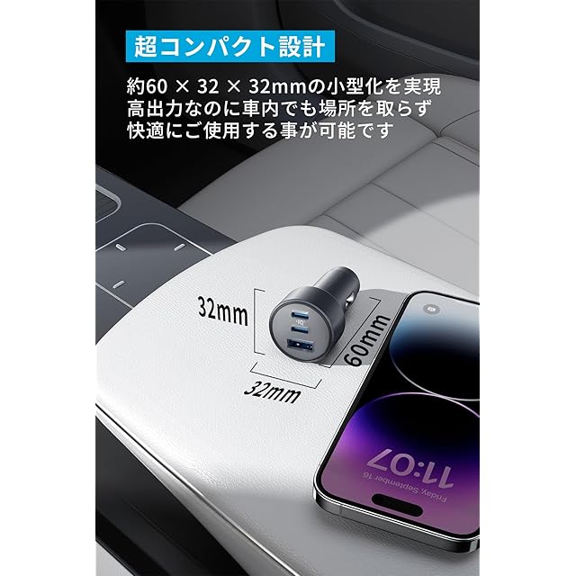 超コンパクト設計:約60 × 32 × 32mmの小型化を実現。一般的な30W出力のカーチャージャーと同じ大きさで、 車内でも場所を取らず快適にご使用する事が可能です。