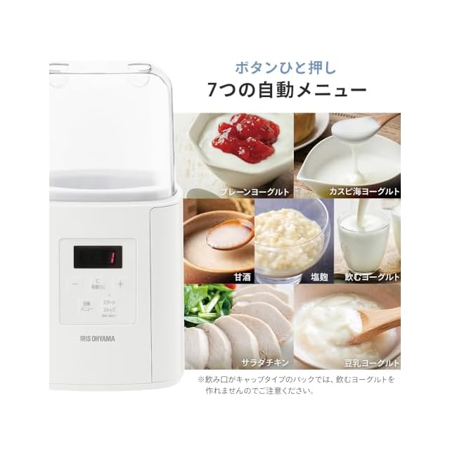 【ボタンひと押し!7つの自動メニュー】プレーンヨーグルト、カスピ海ヨーグルト、甘酒、塩麴、飲むヨーグルト、サラダチキン、豆乳ヨーグルト【注意点】飲み口がキャップタイプのものは、飲むヨーグルトを作れません。