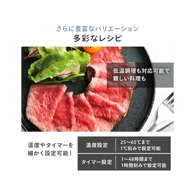 【その他調理機能】低温調理も対応可能で、ローストビーフ等の難しい料理もできます。<温度設定>25~65℃まで1℃刻みで設定可能!<タイマー設定>1~48時間まで1時間刻みで設定可能!