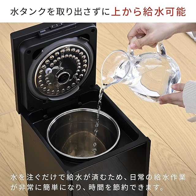 【簡単給水&お手入れ】ふたを開けてそのまま上から給水することができる上部給水タイプ。さらに、水タンクは取り外して、まるごとすみずみまで洗うことができるので、しっかりと汚れを落とすことができ、いつでも清潔にお使いいただけます。