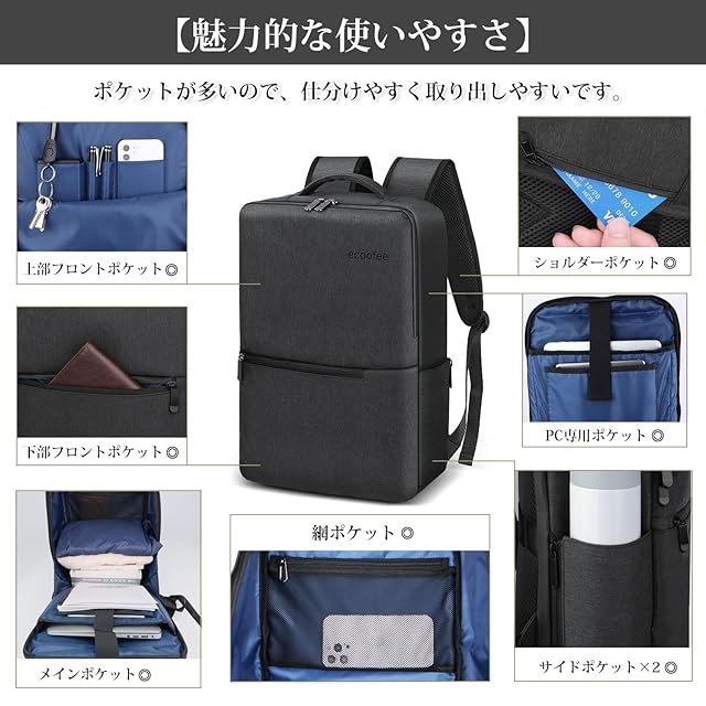商品名:[ecoofee] リュック ビジネスリュック メンズ 防水 15.6インチ PCリュック 止水ファスナー 軽量 リックサックメンズ 大容量 A4収納可 通勤 バックパック 薄型 高校生 通学 出張 旅行 防災 男女兼用 ダークグレー