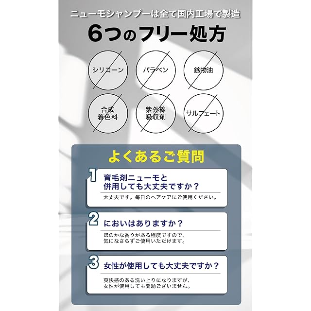 ✅[よくあるご質問] Q:育毛剤 ニューモ と併用しても大丈夫ですか?A:大丈夫です。毎日のヘアケアにご使用ください。Q:においはありますか?A:ほのかな香りがある程度ですので、気になさらずにご使用いただけます。Q:女性が使用しても大丈夫ですか?A:爽快感を感じる洗い上がりになりますが、女性が使用しても問題ございません。