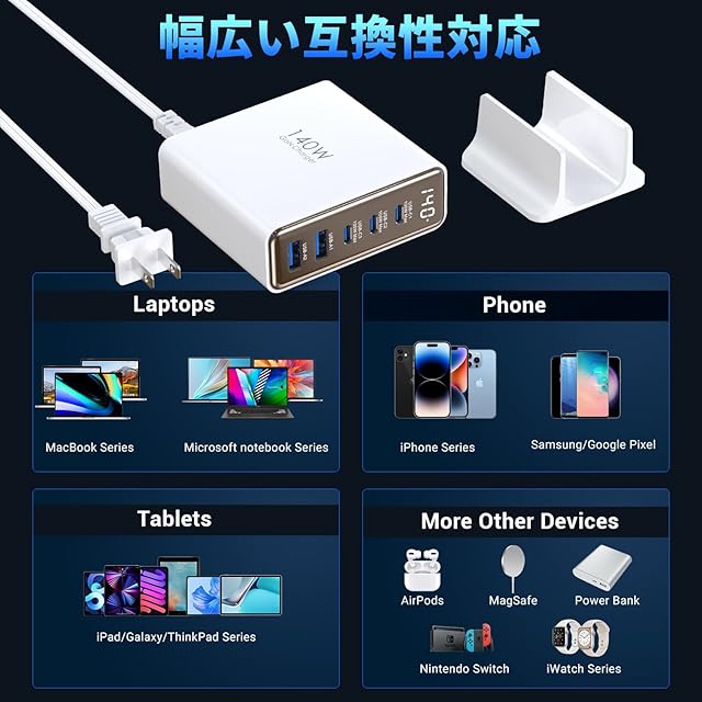 【140W PD急速充電仕様詳細】内容物:140W充電器本体(1.5m AC電源コード付属)・取扱説明書;出力:㊀USB-C1/C2/C3:5V/3A~20V/5A(最大100W)㊁USB-A1/A2:5V/3A~20V/3A(最大60W)※PD充電を行うためには、PD対応ケーブルとPD充電に対応したデバイスが必要となります(スマホ20-30W/ノートPC65W以上が目安)。