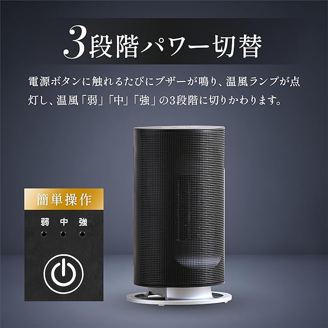 【首振り&温風切替】首振りボタンを押せば、左右55度の範囲での首振り運転が可能で、広範囲に温風を送ります。温風は弱/中/強の3段階で切替可能、起床後などすぐ温まりたい時には「強」 温まってきたら「弱」などお好みで設定してください。