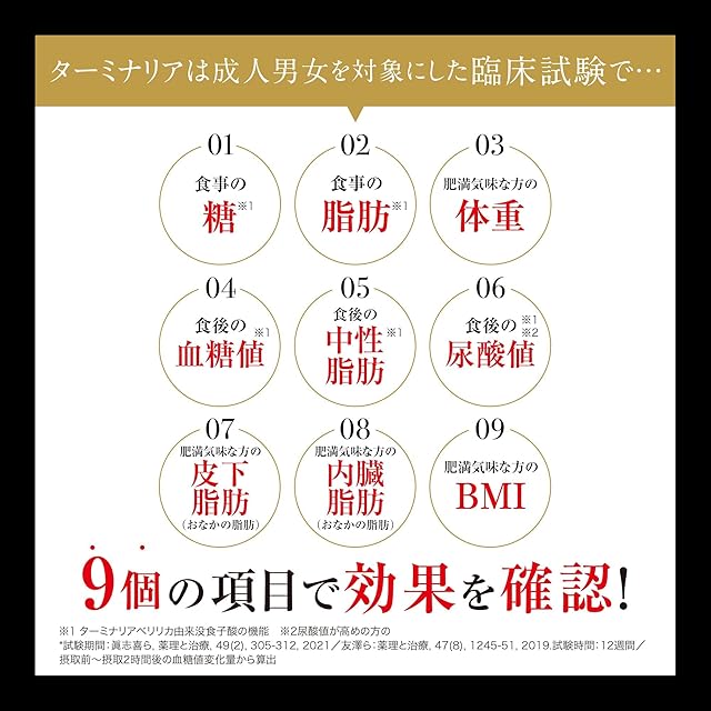【体重やお腹の脂肪など、9つの機能が確認!】ターミナリアファーストは、肥満気味な方の『お腹の脂肪(内臓脂肪と皮下脂肪)と体重を減らすのを助ける』機能性表示食品です。主成分のターミナリアベリリカ由来没食子酸には、『食事の糖や脂肪の吸収を抑え、食後の血糖値や中性脂肪の上昇を抑える機能』も報告されています。