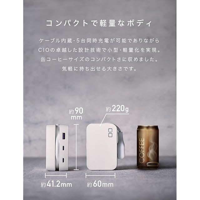 【超小型缶コーヒーサイズ】5台同時充電が可能なケーブル付き電源タップでありながら、缶コーヒーサイズの超コンパクトサイズを実現。旅行や出張などのお出かけ時に気軽に持ち運びやすいよう重さも約220gと軽量に仕上げました。卓上タップとしても使いやすいサイズ感です。