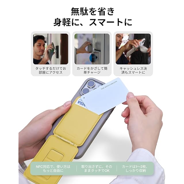 【NFCカード対応!かざすだけでアクセス】マイナンバーカードや運転免許はもちろん、お札や名刺、Suicaなどの交通系ICカードやタッチ決済に対応したクレジットカード、カードキーまで収納可能。カバンから取り出す手間なく、本体ごとタッチするだけでスムーズな決済が可能です。カードケースには1~2枚のカードまで収納できますが、NFC機能を使用するためには、カードを1枚だけ入れてください