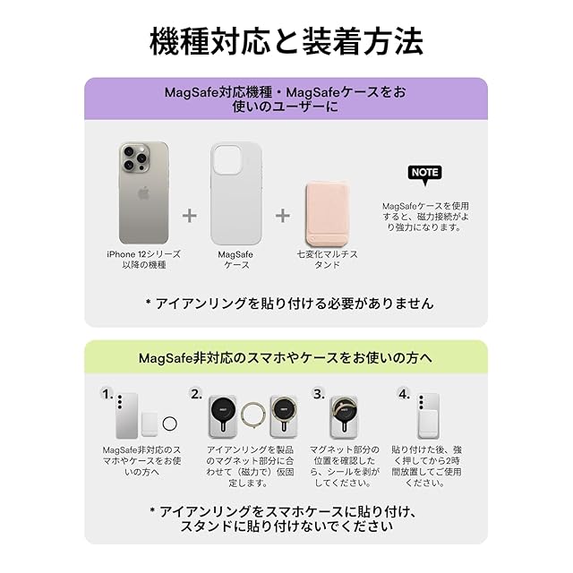 【アイアンリング付き・全機種対応】この携帯スタンドはこの携帯スタンドは iPhone 17 /16/15/14/13/12シリーズ(Pro/Pro Max/Plus/Mini含む)に対応。。背面にマグネットが付いていないスマートフォンも、付属のアイアンリングをスマートフォンケースに取り付けるだけで、MOFT七変化マルチスタンドで使用できます。 製品にはマグネットリングが付属しています。取り付け方法については、詳細ページの動画をご参照ください。【注意:粘着面がある側はスマホケースまたはスマホの背面に貼り付けてください。スタンドには貼り付けないでください。】