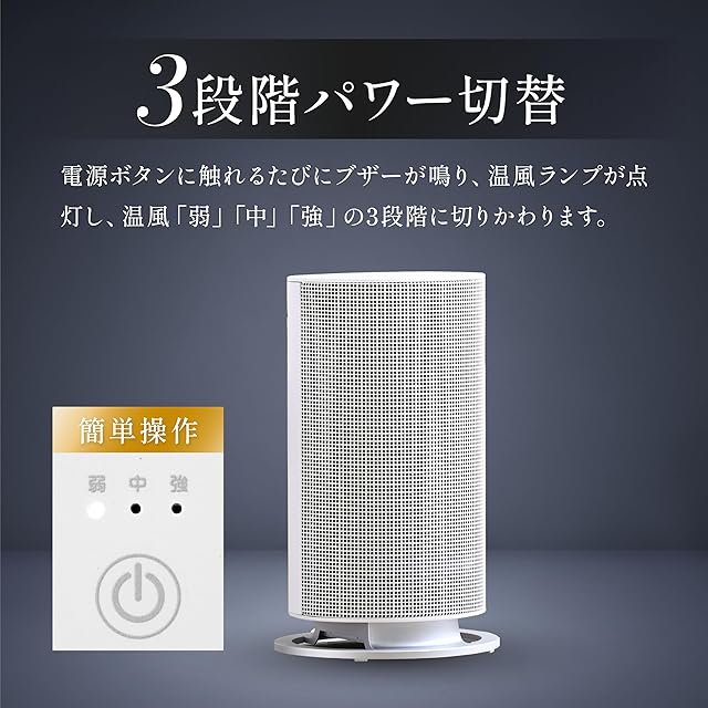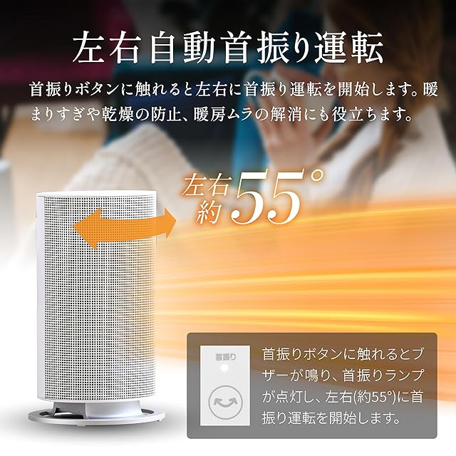【首振り&温風切替】首振りボタンを押せば、左右55度の範囲での首振り運転が可能で、広範囲に温風を送ります。温風は弱/中/強の3段階で切替可能、起床後などすぐ温まりたい時には「強」 温まってきたら「弱」などお好みで設定してください。