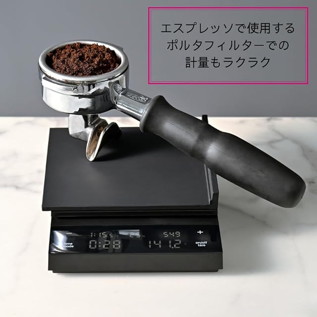 【エスプレッソの計量もラクラク】本体カバーは直角に角度がついているので、エスプレッソで使うポルタフィルターを使って計量する際にも役立ちます。