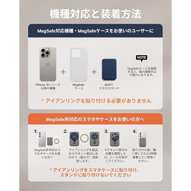 【アイアンリング付き・全機種対応】この携帯スタンドは iPhone 17/16/15/14/13/12シリーズ(Pro/Pro Max/Plus/Mini含む)に対応。背面にマグネットが付いていないスマートフォンも、付属のアイアンリングをスマートフォンケースに取り付けるだけで、MOFT 8-in-1多機能スタンドを使用できます。 製品にはマグネットリングが付属しています。取り付け方法については、詳細ページの動画をご参照ください。【注意:粘着面がある側はスマホケースまたはスマホの背面に貼り付けてください。スタンドには貼り付けないでください。】