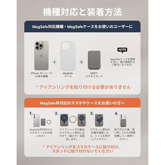 【アイアンリング付き・全機種対応】この携帯スタンドは iPhone 17/16/15/14/13/12シリーズ(Pro/Pro Max/Plus/Mini含む)に対応。背面にマグネットが付いていないスマートフォンも、付属のアイアンリングをスマートフォンケースに取り付けるだけで、MOFT 8-in-1多機能スタンドを使用できます。 製品にはマグネットリングが付属しています。取り付け方法については、詳細ページの動画をご参照ください。【注意:粘着面がある側はスマホケースまたはスマホの背面に貼り付けてください。スタンドには貼り付けないでください。】