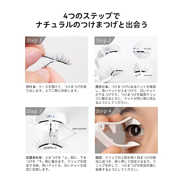 良質な動物実験フリー素材:動物実験フリー、清潔で、軽く、独特で快適。厳選した動物実験フリー素材による快適さ、柔らかい装着感を目に与えます。たっだ0.034gのつけまつげは、羽のようにふんわりで、目に呼吸感を与え、最高な快適さを手に入れます。(Tips:目はデリケートなので、つけまつげをつけたら、慣れるまで一定の時間が必要です)