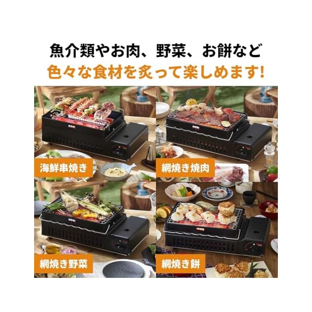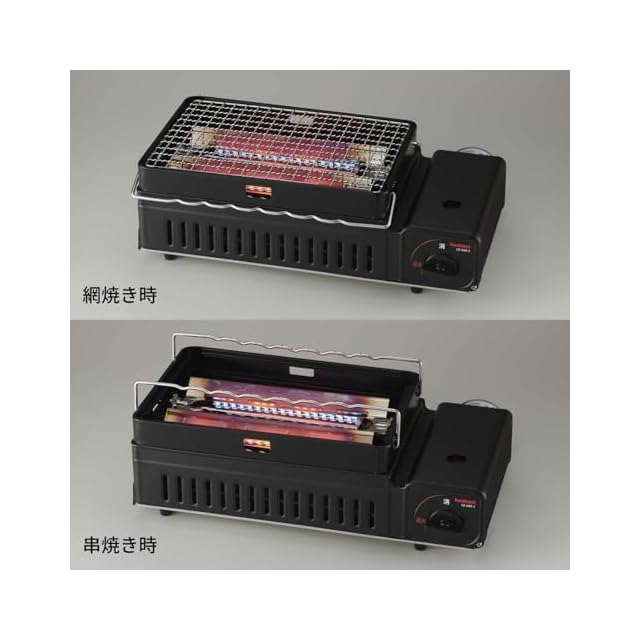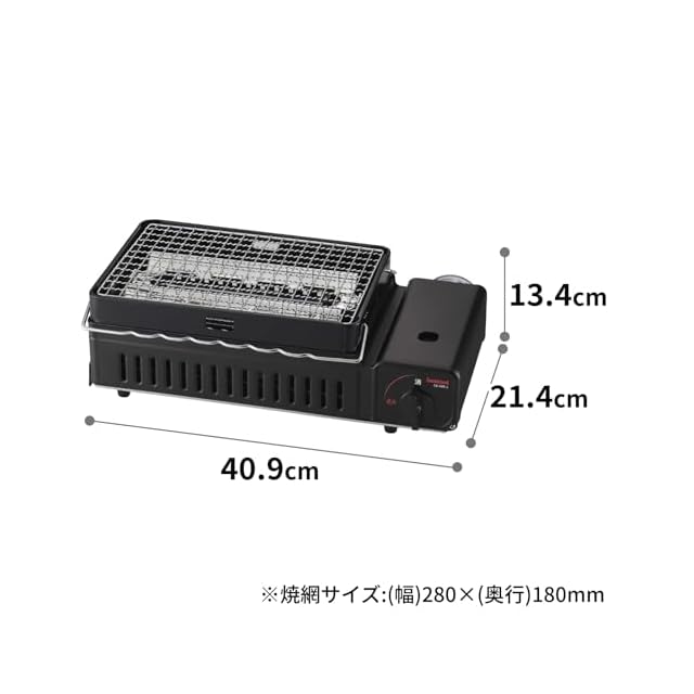 メーカー型番:CB-ABR-2/本体サイズ:幅409×奥行214×高さ134mm/商品重量:約2.4kg/カラー:マットブラック/材質:[本体] 鋼板 (粉体塗装)、[串焼きステー] スチール (メッキ加工)、[U字バーナー] スチール (メッキ加工)、[受け皿] スチール (ホーロー加工)、[焼網] ステンレス/ガス消費量:約169g/h/連続燃焼時間:約90分/点火方式:圧電点火方式/安全装置:圧力感知安全装置、他/容器着脱方式:マグネット方式/使用ガス:イワタニカセットガス