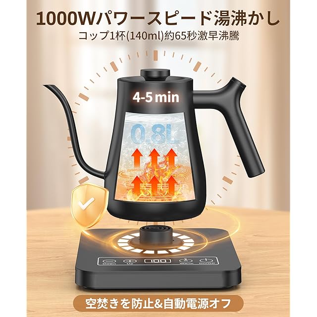 ☕【快速沸騰&最大24時間保温】1000Wのハイパワーで、素早く加熱し、ご希望の温度に達すると自動的にスイッチが切れるスマート電気ケトルです。MAX水位時でも約4分で高速沸騰することができます、忙しい時間帯でも、手軽にコーヒーなどが楽しめます。設定温度になると、ケトルがピーッと鳴ります。コーヒーケトルの保温時間は、初期設定で8時間。また、電源ボタンを3秒長押しすることで時間設定ができ、保温時間は1~24時間まで設定可能です。ハンドドリップの準備や抽出を行っているときにお湯の温度が低下してしまうのを防げます。