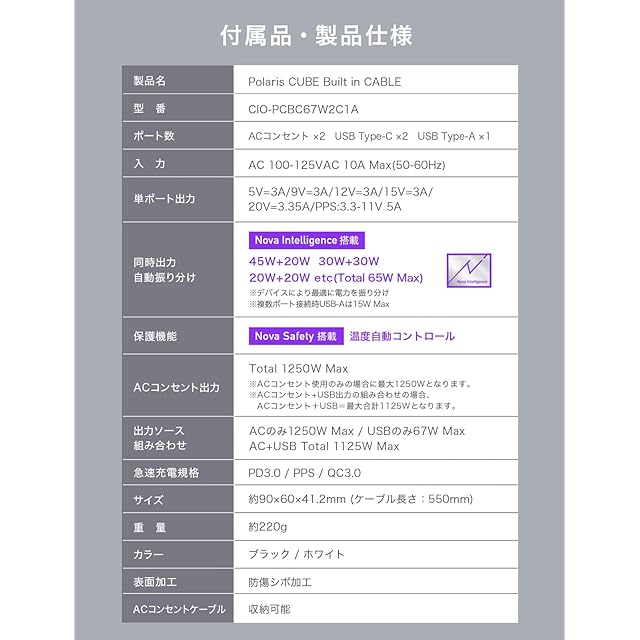 【安全機能 独自技術NovaSafety搭載】ポラリスキューブ ビルトインケーブルをより安心して長くご使用いただきたい。そうした想いからCIO独自技術『NovaSafety』を搭載。製品温度を常に監視し、製品高負荷時に自動的に電力調整を行います。
