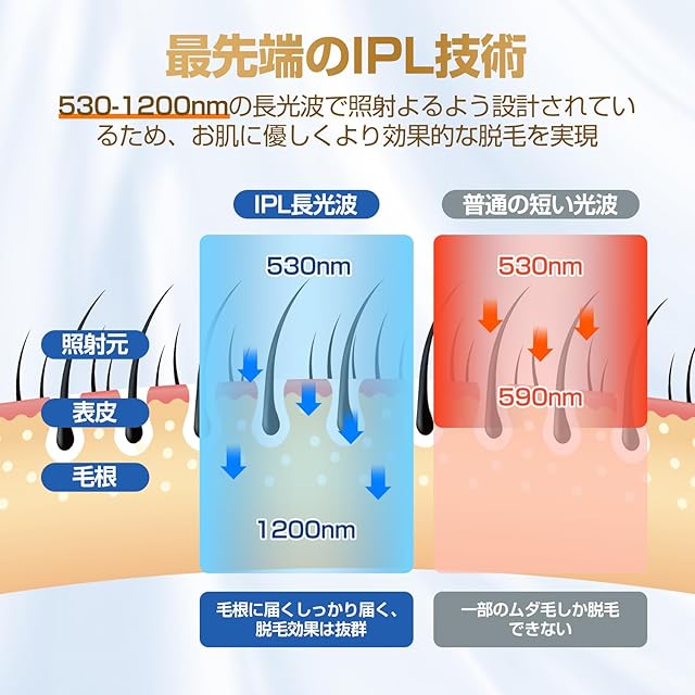 【最短4週間で効果を実感】IPLパルス光は特定の波長を利用し、毛包にあるメラニン色素にダメージを与えて、定期的に照射することで、体毛の成長が遅くなり、ムダ毛ケアが実現します。最短4週間で効果を実感。