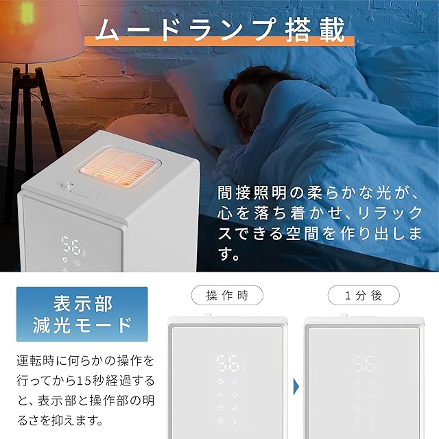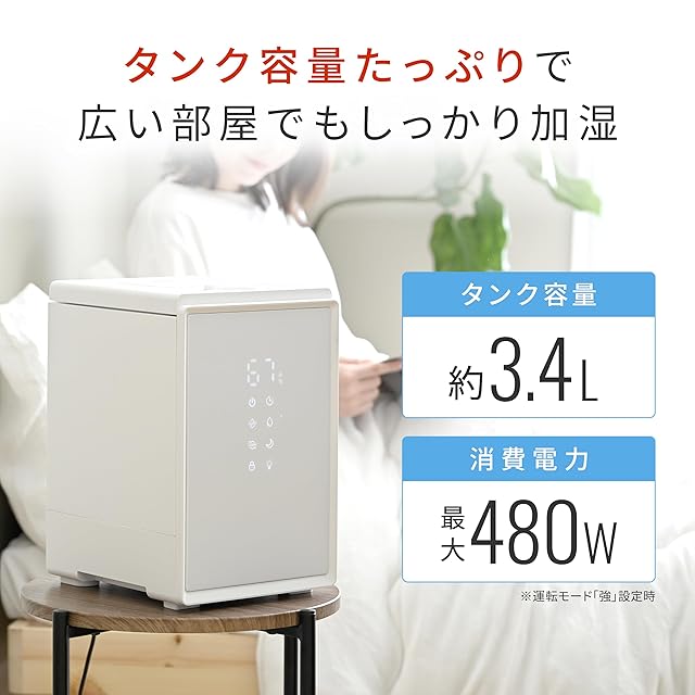 【タイマー】12時間まで1時間単位で設定できる切タイマー機能搭載。就寝時も空焚きを気にすることなく快適に過ごせ、切り忘れ防止にも役立ちます。また、湿度50~60%を保つように、強弱を自動的に切り換えながら運転するおやすみモードも搭載しております。