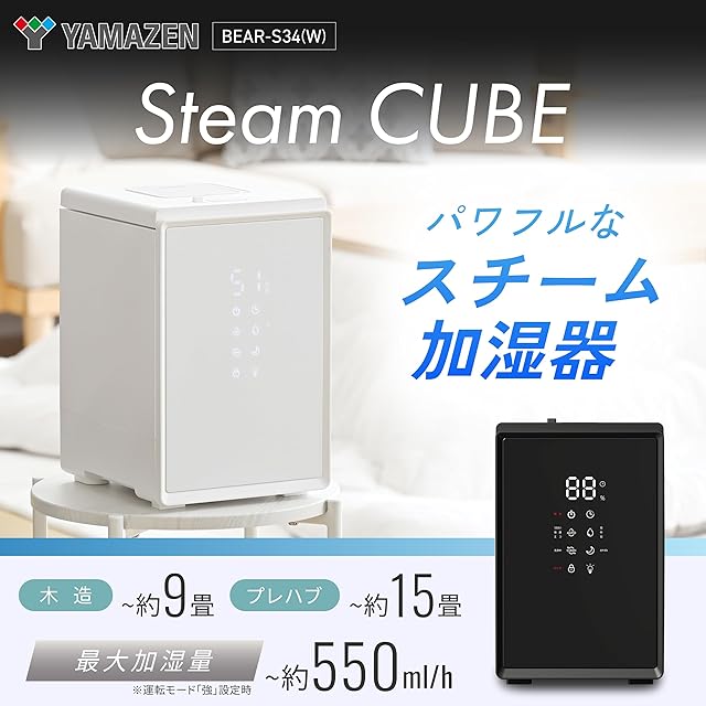 商品名:[山善] 加湿器 加熱式 スチーム式 上部給水 キューブ型 湿度センサー 転倒防止 間接照明 寝室 チャイルドロック 自動運転 ホワイト BEAR-S34(W)
