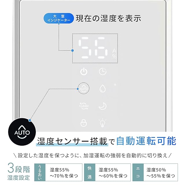 【選べるAUTOモード】設定した湿度を保つように、加湿運転の強弱を自動的に切り換えるAUTOモード。「うるおい」では湿度55%~70%を保つように運転、「快適」は湿度55%~60%を保つように運転、「エコ」では湿度50%~55%を保つように運転します。