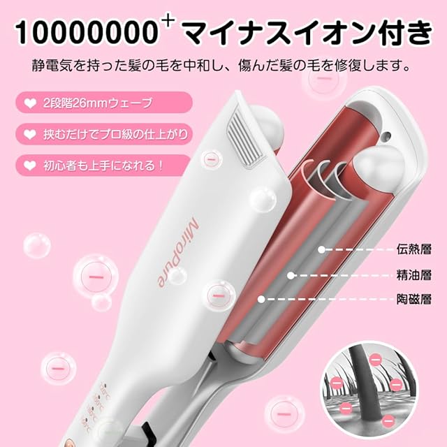 商品名:MiroPure ヘアアイロン カール ウェーブアイロン 26㎜ 挟むだけで可愛い カールアイロン 実現 160℃~220℃ 千万級マイナスイオン吹出 やけど防止 初心者向けカールアイロン プレゼントも最適 海外対応 PSE認証済 日本語取扱説明書付き ホワイト