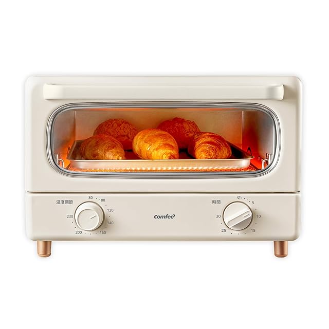 【商品仕様】COMFEE' レトロオーブントースター:◇外形寸法:幅34.6*奥行36.6*高さ23.5cm、約4.4kg ◇庫内寸法:幅27.7*奥行28*高さ19.6cm◇容量:トースト4枚焼き(25㎝ピサ) ◇電源:AC100V ◇最大出力:1300W ◇タイマー:最大30分 ◇ヒーター:3本 ◇温度範囲:80-230℃◇付属品:パンくずトレイ*1・日本語取扱説明書◇設置:散熱のため、上は10㎝、周囲は4.5㎝の隙間を開けてください※ 製品期間:一年間