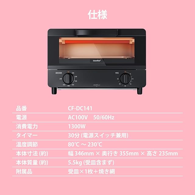 【商品仕様】COMFEE' オーブントースター:◇コンパクトなサイズ:34.6D x 35.5W x 23.5H cm,約5.56kg ◇容量:14L、トースト4枚焼き ◇電源:AC100V ◇最大出力:1,300W ◇タイマー:最大30分 ◇機能:ピザ・トースト・切り餅・グラタン・バターロールなどの焼き料理、フライ温めなど◇付属品:パンくずトレイ・焼き網・日本語取扱説明書※ 製品期間:一年間
