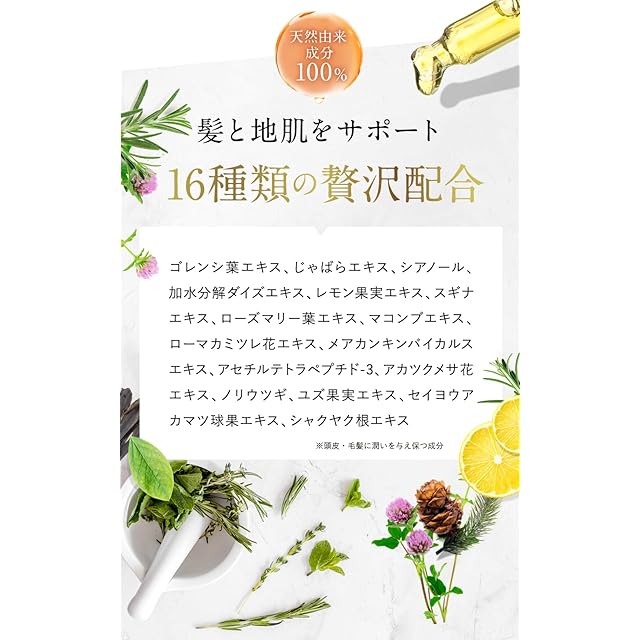 ✨インコスメティックス受賞成分配合:今注目されている黒サポート成分(ダークニル)を推奨量配合。茶葉エキスなどを贅沢に使用し艶髪を作り出すお手伝いをします。 ✨天然由来成分100%:ゴレンシ葉エキスをはじめとする天然由来成分を100%配合し、優しく洗いながら髪と頭皮をサポートします。 ✨無添加処方:合成香料、合成着色料、合成ポリマー、カチオン界面活性剤、石油系界面活性剤、パラベン、鉱物油、紫外線吸収剤、小麦由来たんぱく成分は使用しておりません。体に使うものだから、無添加処方にこだわりました。
