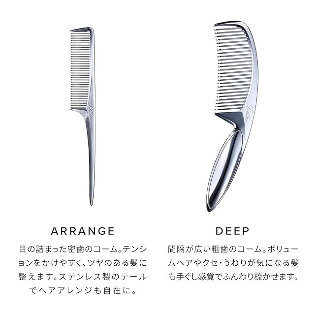 【ARRANGE】目の詰まった密歯コーム。テンションをかけやすく、ツヤのある髪に整えます。ステンレス製のテールでヘアアレンジも自在に。