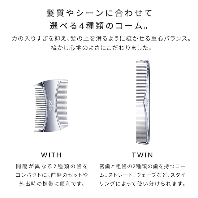 【髪質やシーンに合わせて選べる4種類のコーム】力の入りすぎを抑え、髪の上を滑るように梳かせる重心バランス。梳かし心地のよさにこだわりました。