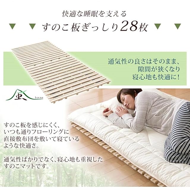 【スタッフのおすすめポイント】<br><br>・布団を湿気・結露から守るすのこマット ・すのこ板に凹凸を付けた通気性抜群のリブ加工<br> ・すのこ枚数はぎっしり28枚!ごつごつ感を軽減<br> ・耐久性のあるすのこ厚1.3cm<br> ・お子様にも安心の低ホルムアルデヒド仕様<br> ・二つ折りにして布団干しも楽に!<br> ・折りたたみ固定は簡単マジックテープ式<br> ・キズ防止クッション付き<br> ・搬入ラクラク!コンパクト梱包でお届け
