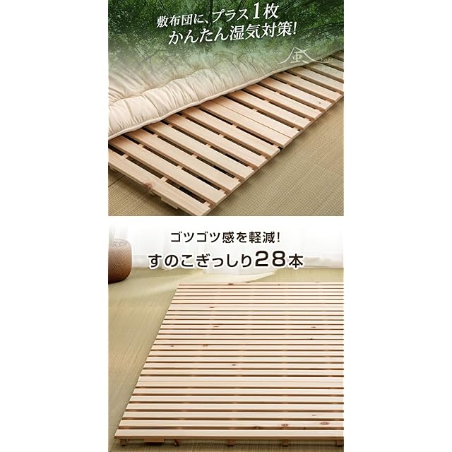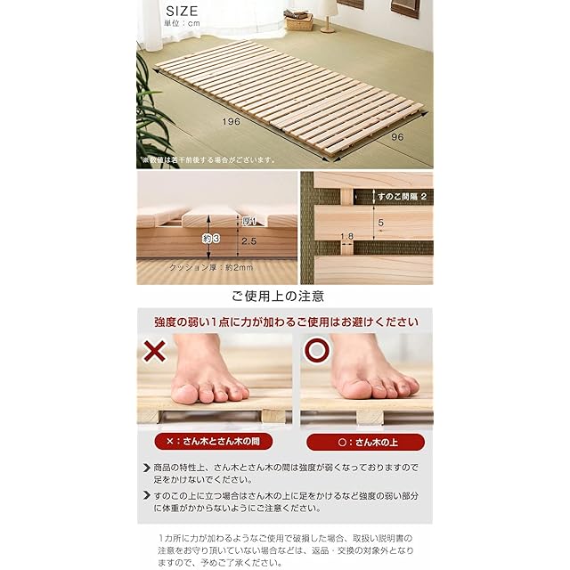 【ご使用上の注意】※すのこの上に立つ場合はさん木の上に足をかけるなど強度の弱い部分に体重がかからないようにご注意ください。 ※飛び跳ねたり、一点に荷重をかけたりすると割れる恐れがあります。 ※固綿入りの厚手の敷布団や、マットレスでの使用を奨励しています。 ※1カ所に力が加わるようなご使用で破損した場合、取扱い説明書の注意をお守り頂いていない場合などは、返品・交換の対象外となりますので、予めご了承ください。